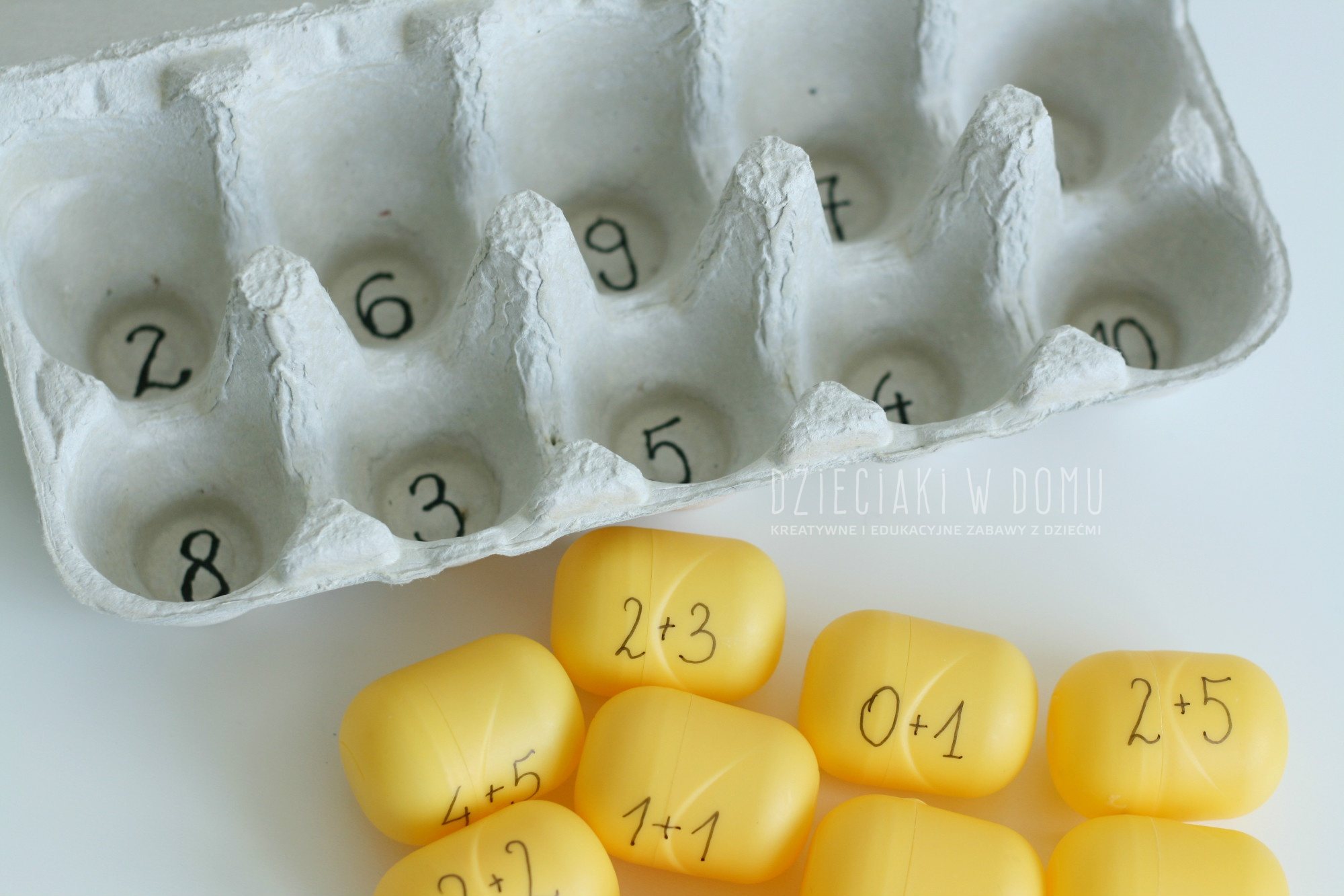 Лоток из-под яиц и капсулы от киндеров тоже не спешите выбрасывать, их можно превратить в нескучную игру. На фото вариант со сложением, но его можно заменить на вычитание, умножение или деление. Игра хороша тем, что ребёнок может руками «разбирать» и «собирать» новые примеры.